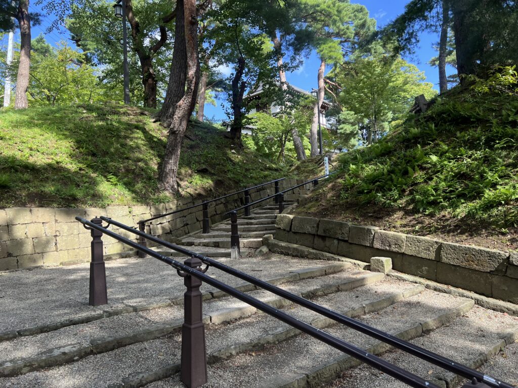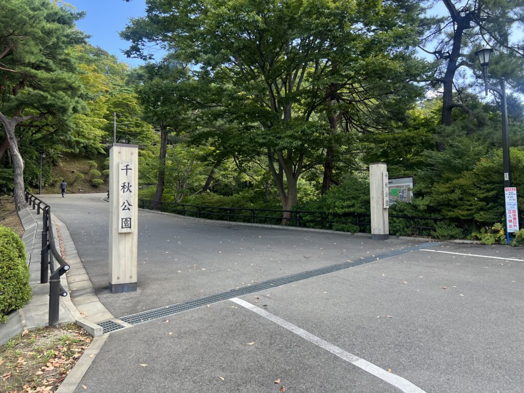 公営施設がたくさん立ち並ぶ中、道路を進んでいくと千秋公園の正式な入口を発見します。