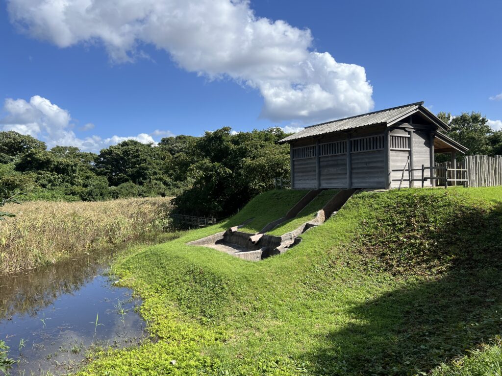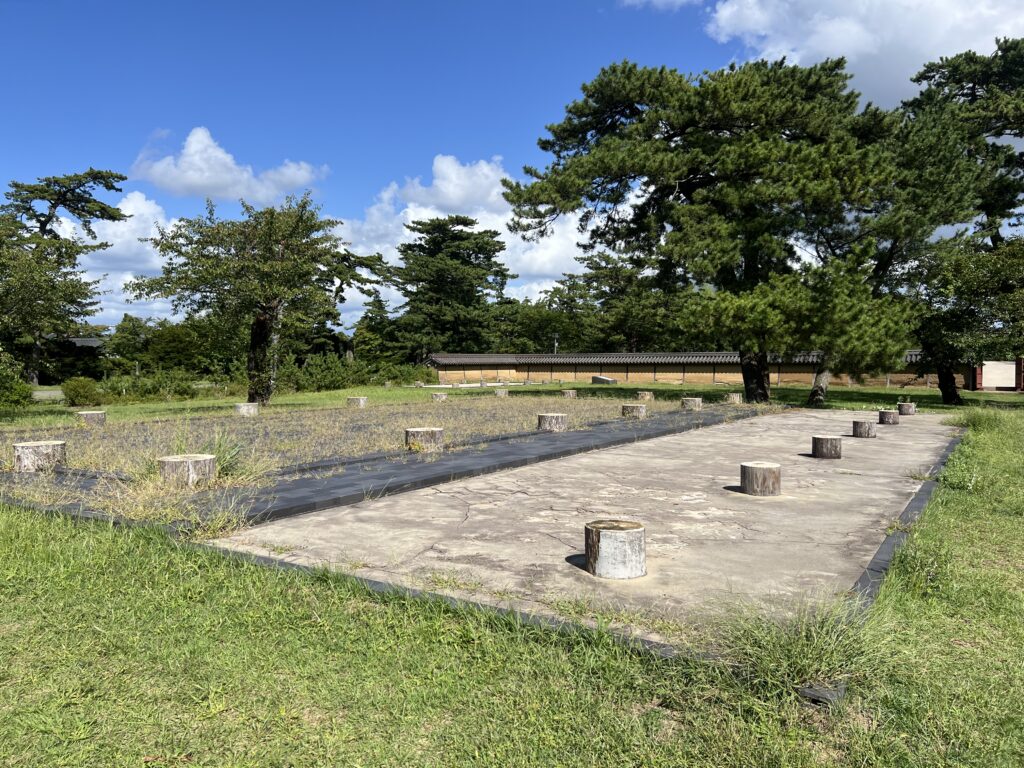 資料館側から橋が出ているので、その橋を渡って政庁西門と築地塀の跡地に向かいます。
