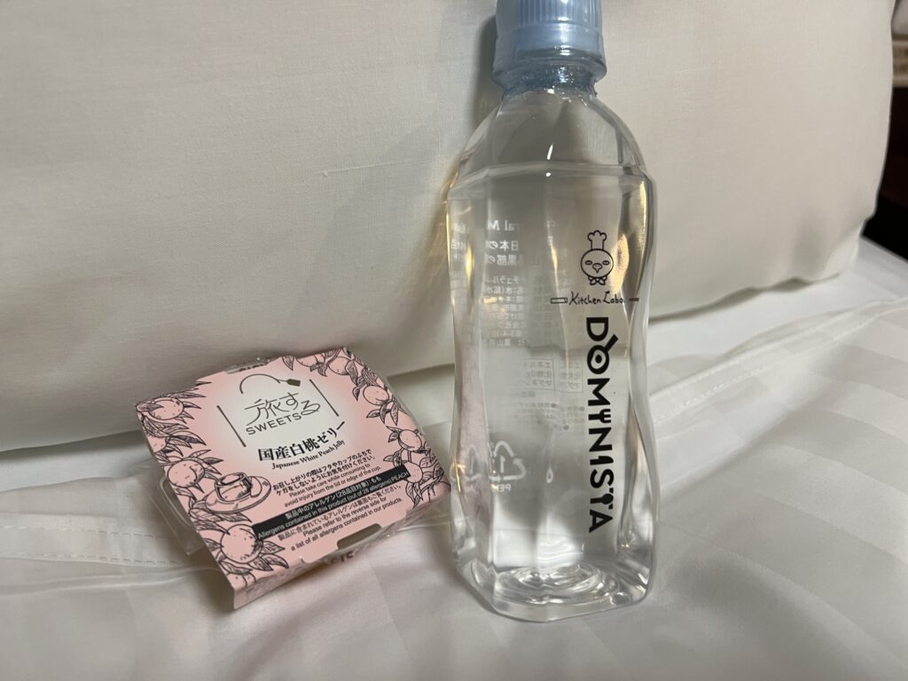 おもてなしサービスとして、水と桃ゼリーが冷蔵庫に入っていました。