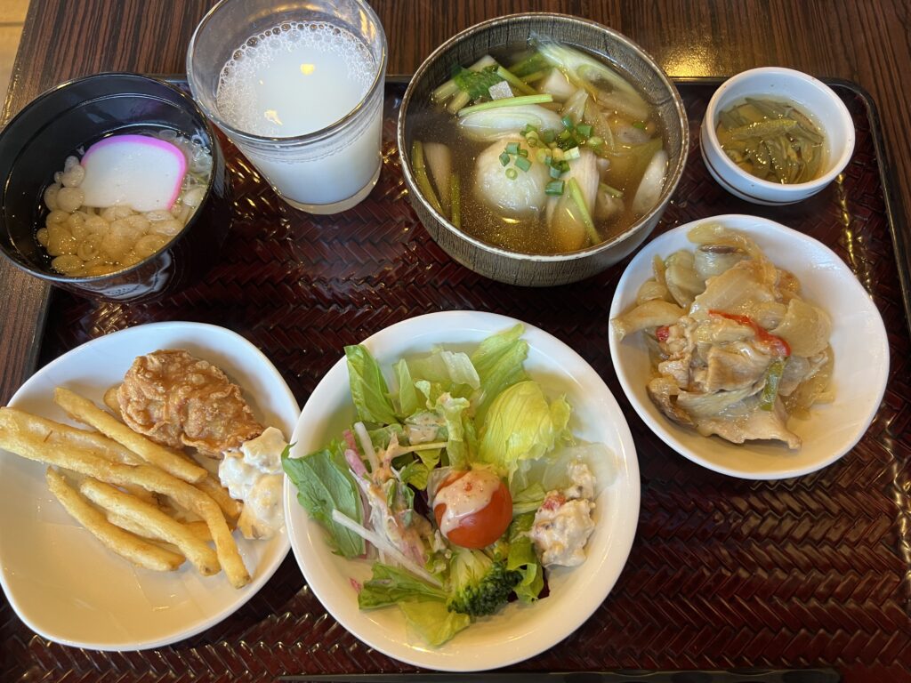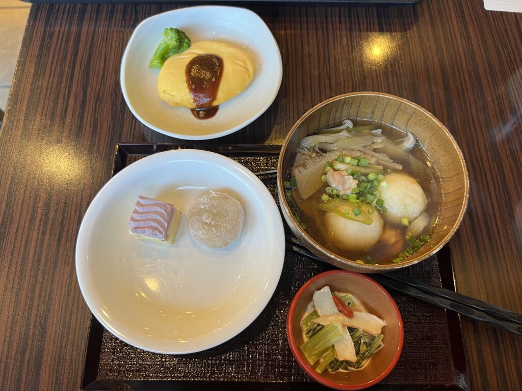 2周目はオムレツ、辛子高菜、だまこ汁、さつまいもケーキと大福もちのデザートです。